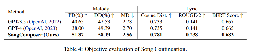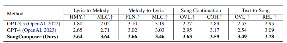 另外,在主观评估中发现SongComposer在和声和旋律-歌词的搭配方面比GPT-3.5和GPT-4要好很多。这意味SongComposer更擅长让歌词和旋律相互配合得更好,让整首歌听起来更和谐。