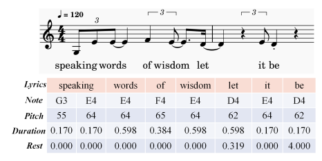 这种元组格式明确地为模型提供了歌词和旋律之间的相互映射,有助于掌握元素之间的对应关系。