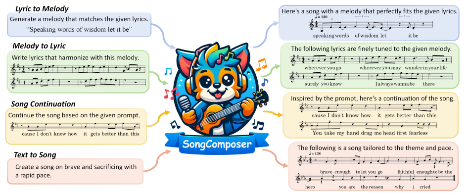 SongComposer利用符号化的歌曲表示法来生成旋律和歌词,在各种任务中表现出色,如将歌词转换为旋律、旋律生成歌词、歌曲延续和基于文本描述的歌曲创作,甚至在性能上超越了像GPT-4这样的先进LLM模型。
