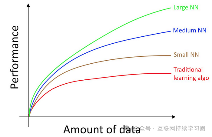 Andrew Ng早在2016、2017就在各种场合画出过以下这张图,在Deep Learning.ai的课程中也时常出现,这张图原本是用来说明NN跟传统ML的适用时机,但却也显现出,对于研究员而言,早就具备一些关于Scaling的直觉。像是:Model越大、Data越多,performance都会随之提升