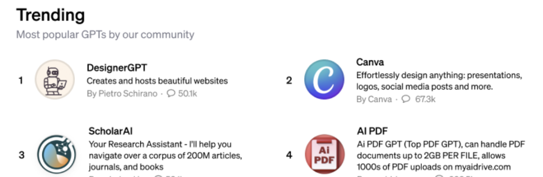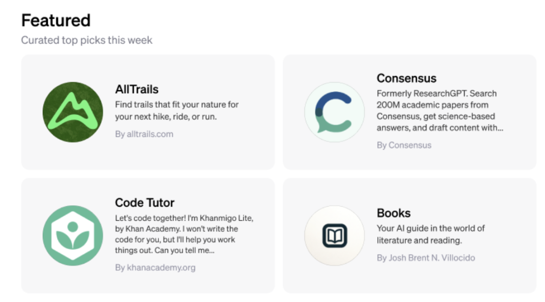 GPT 商店还将重点突出有用和有影响力的 GPTs,OpenAI首批推荐的GPTs 包括: