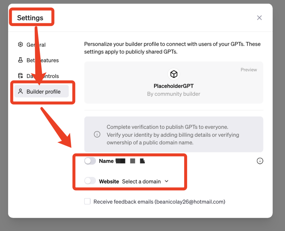 2.验证你的构建者资料(设置 → 构建者资料 → 启用您的姓名或已验证的网站)。