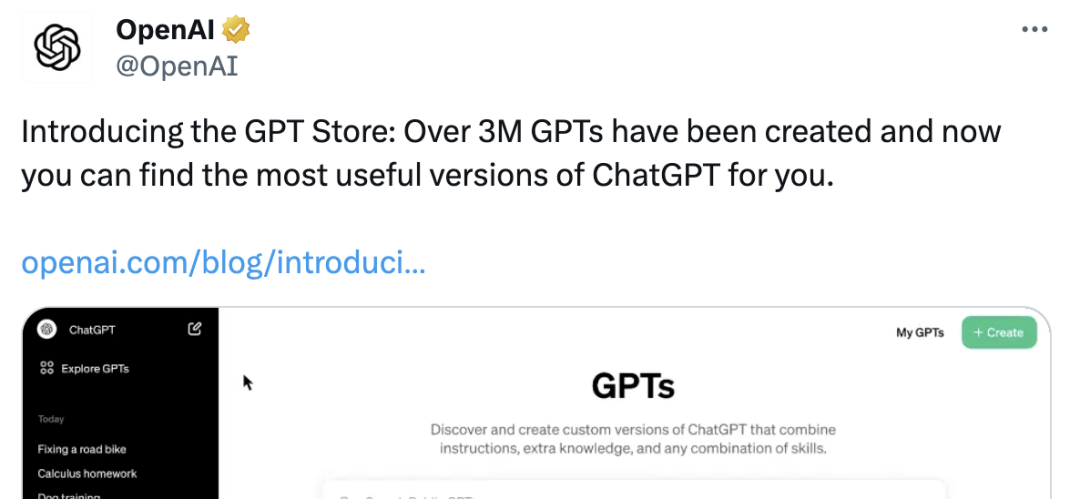 OpenAI在推特上更是霸气地表示,目前用户已创建超过 300 万个 GPTs,现在你可以找到最适合你的专属“ChatGPT”。