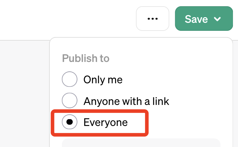 1.将你的 GPT 保存为“for Everyone ”(Anyone with a link将不会显示在商店中)。
