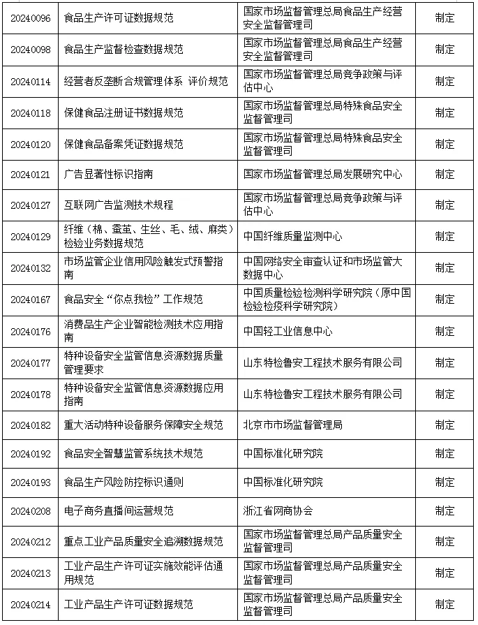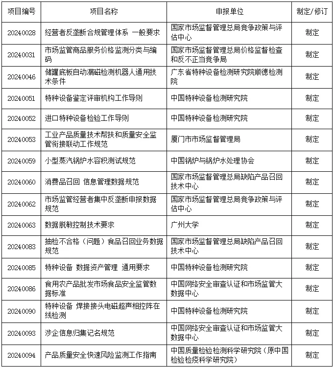 为深入贯彻落实《国家标准化发展纲要》,充分发挥标准化对市场监管业务的支撑保障作用,根据《市场监管行业标准管理办法》《市场监管行业标准制定管理实施细则》(国市监办发〔2023〕36号)等有关规定,中国网络安全审查认证和市场监管大数据中心组织开展了2024年度市场监管行业标准制修订项目申报工作。经各单位申报、业务主管司局初审、专委会专家评审,拟对《经营者反垄断合规管理体系 一般要求》等44项标准予以立项,现将标准项目名称、申报单位予以公示(名单见附件)。