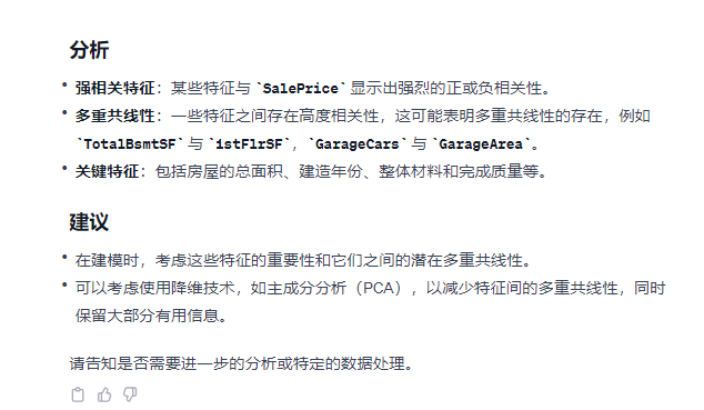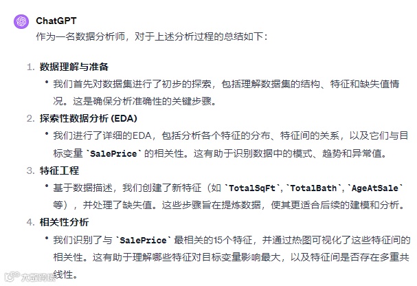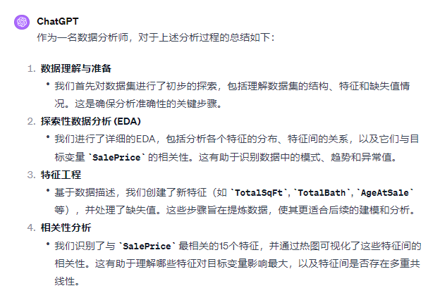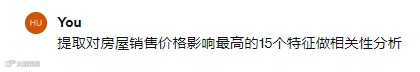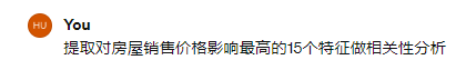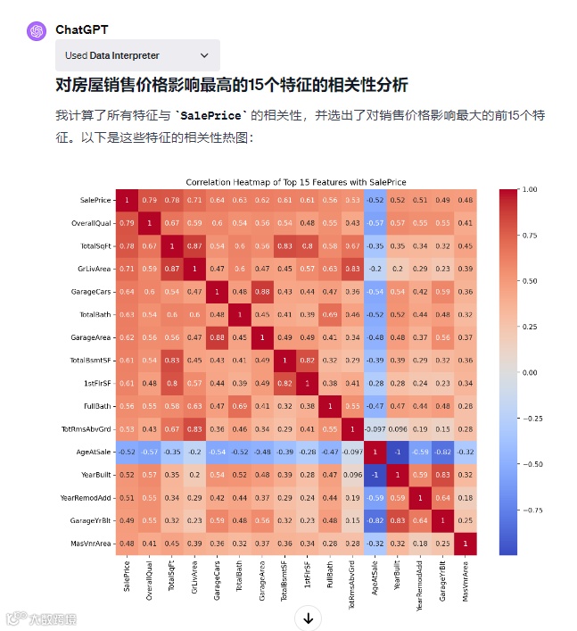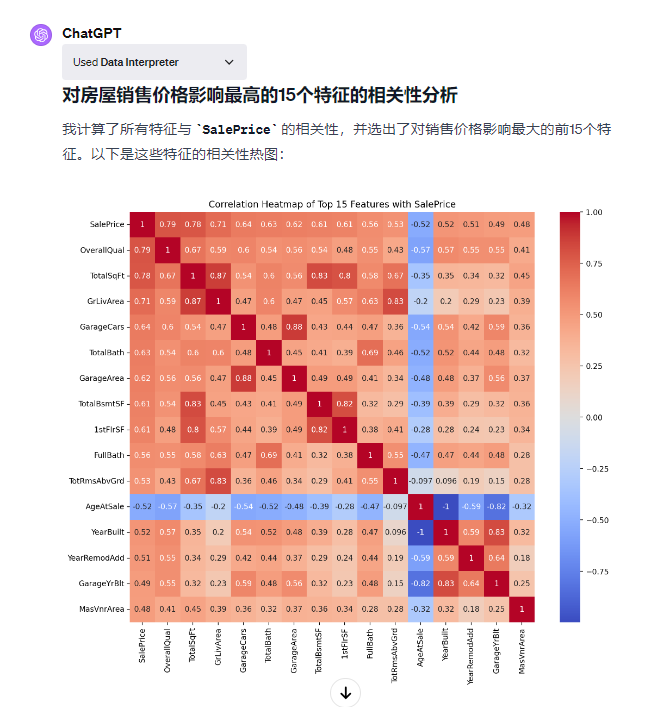 最后我们让ChatGPT对数据集中对房价影响最大的15种数据进行相关性分析。