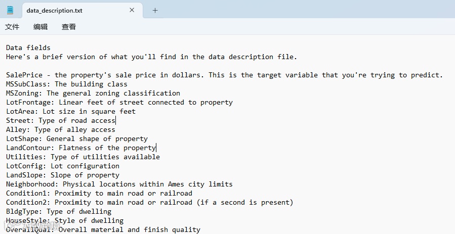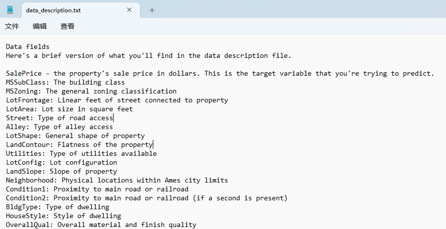 其中[data_description.txt]文件主要是对数据集中每一列的描述。