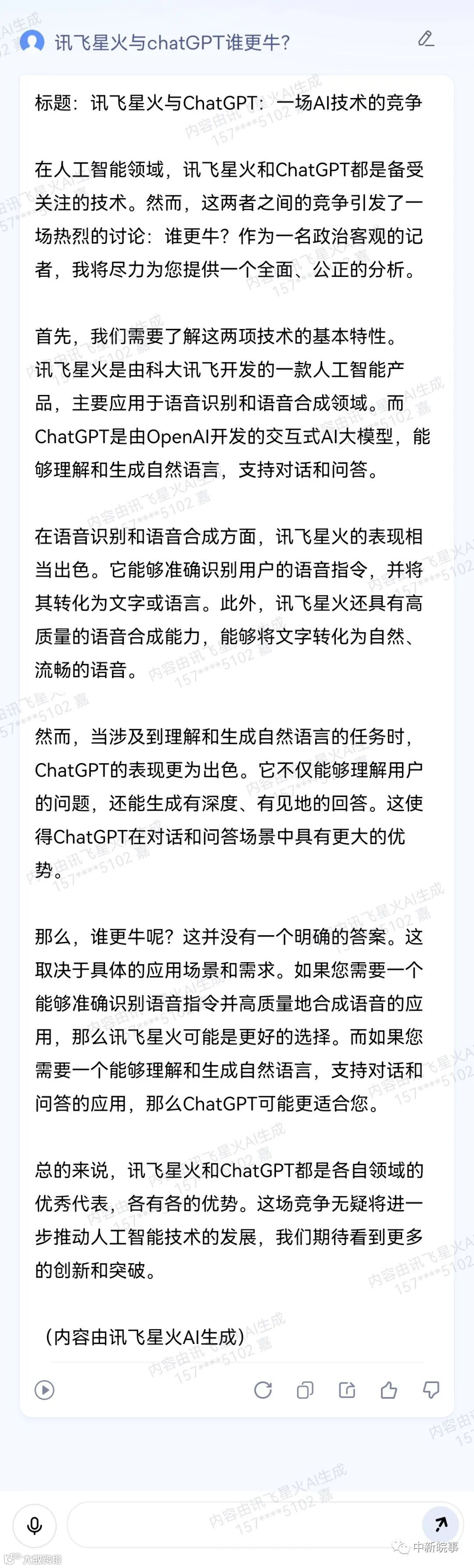 总的来说,讯飞星火和ChatGPT都是各自领域的优秀代表,各有各的优势。这场竞争无疑将进一步推动人工智能技术的发展,我们期待看到更多的创新和突破。”