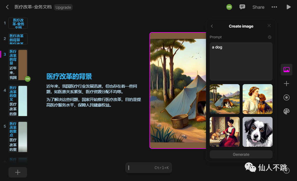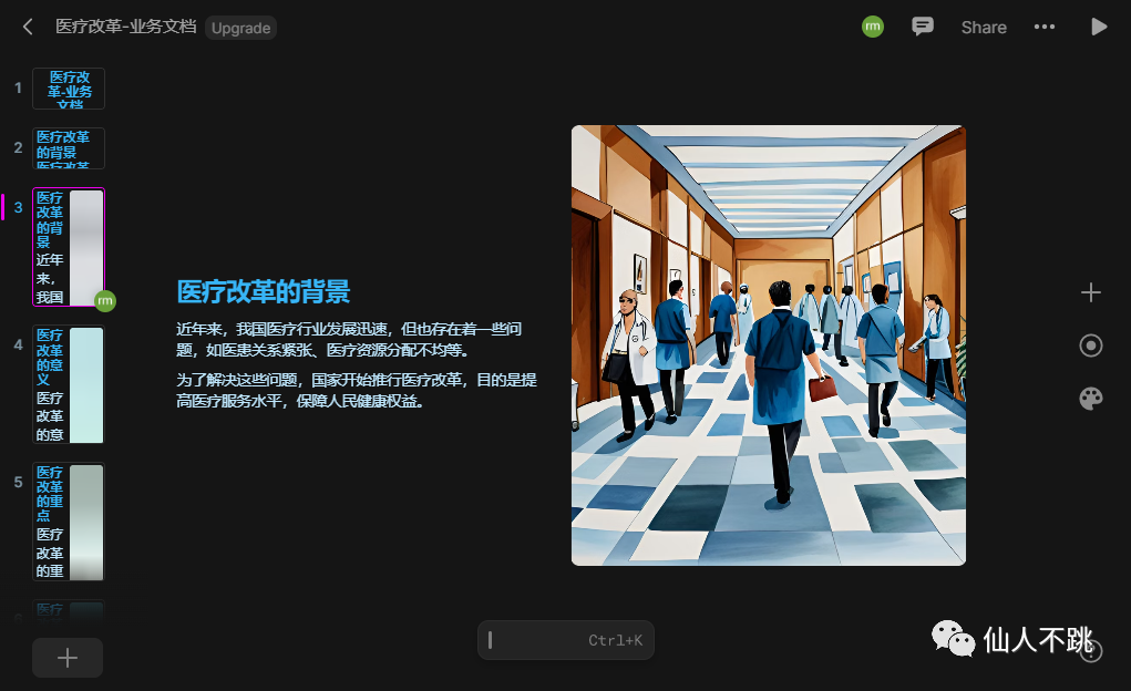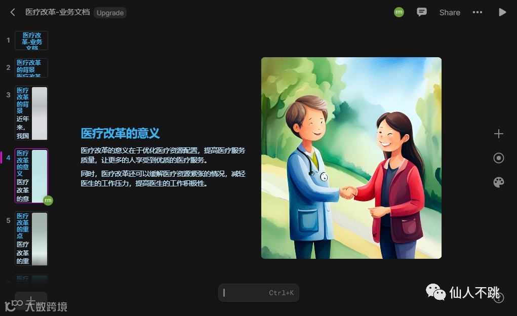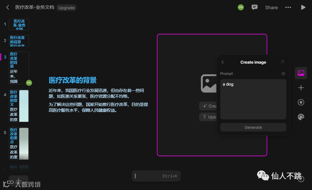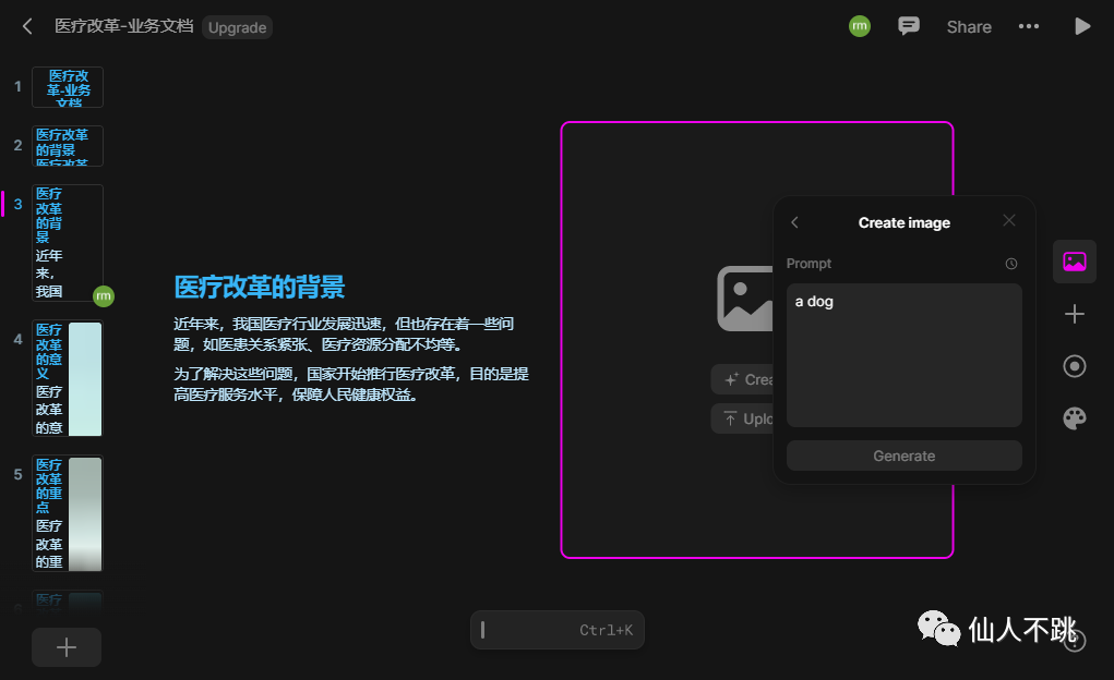 选择“Create presentation about...”后,直接在输入框里输入你的需求,如:我想做个关于医疗改革的业务介绍文档。