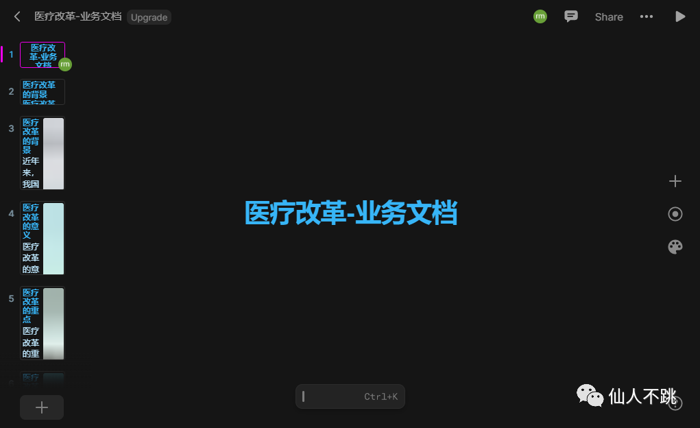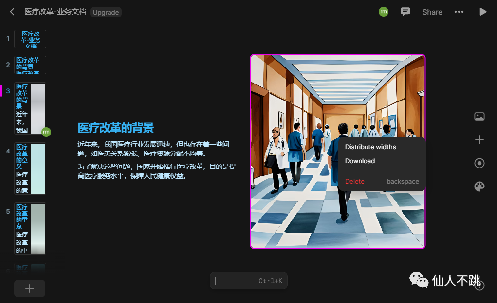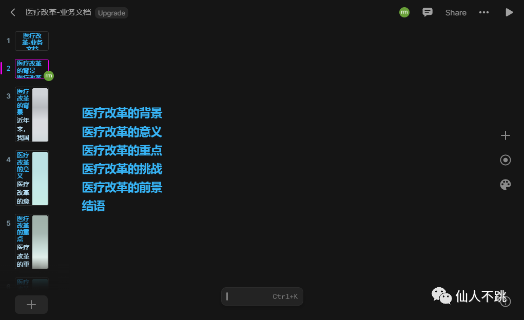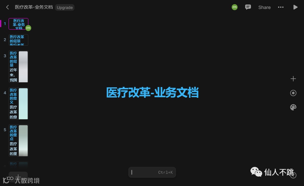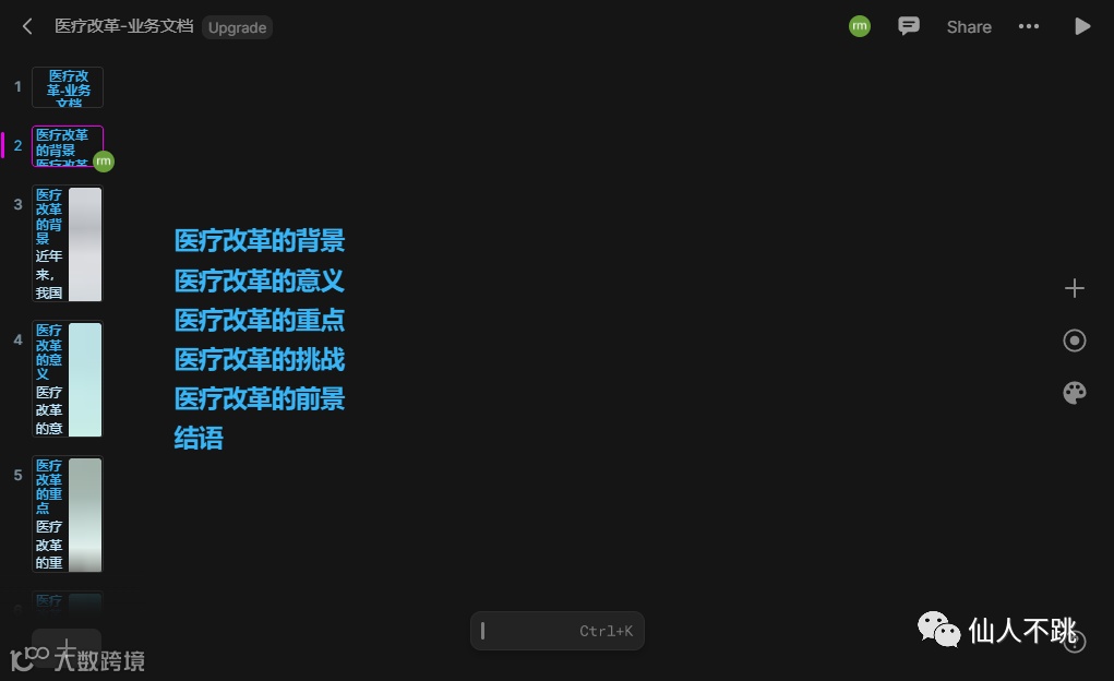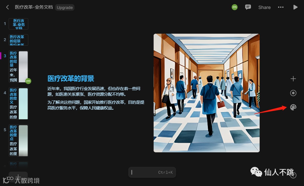 选择“Create presentation about...”后,直接在输入框里输入你的需求,如:我想做个关于医疗改革的业务介绍文档。
