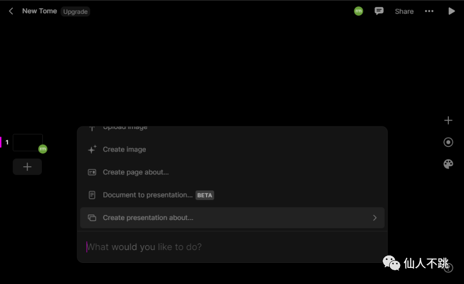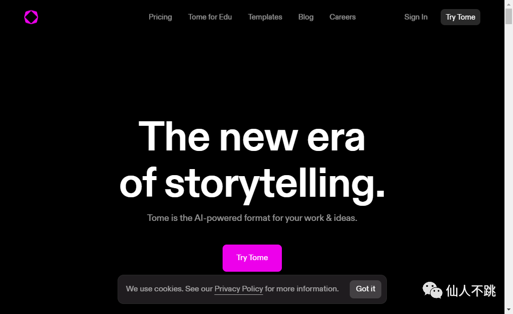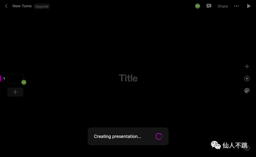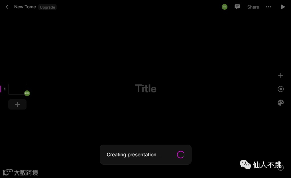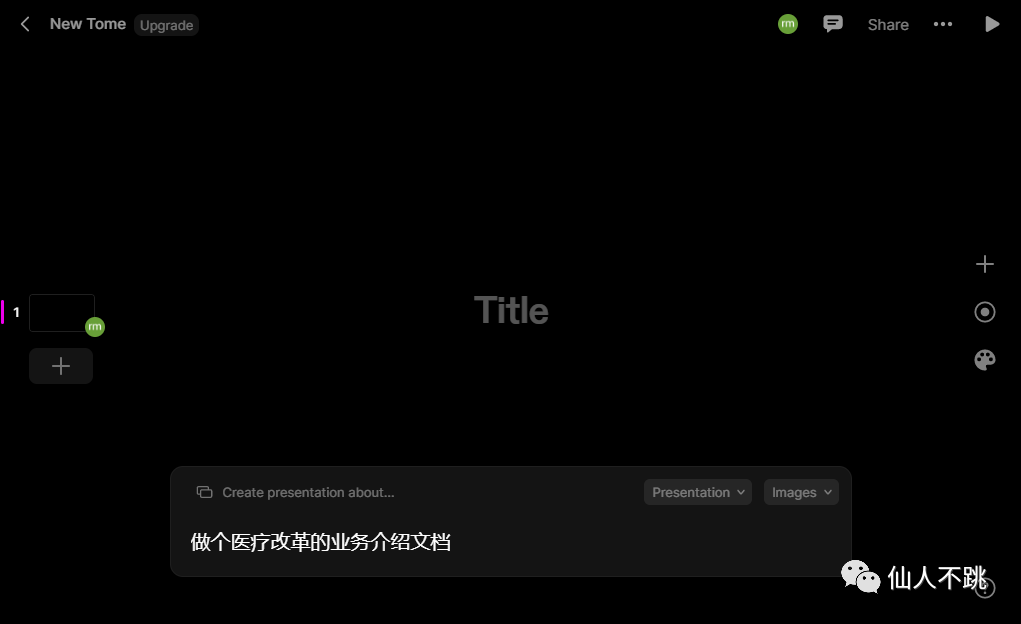 TOME是一款基于AI技术的PPT生成工具,它可以根据用户输入的标题或特定描述自动生成完整PPT,包括大纲、配图和内容。