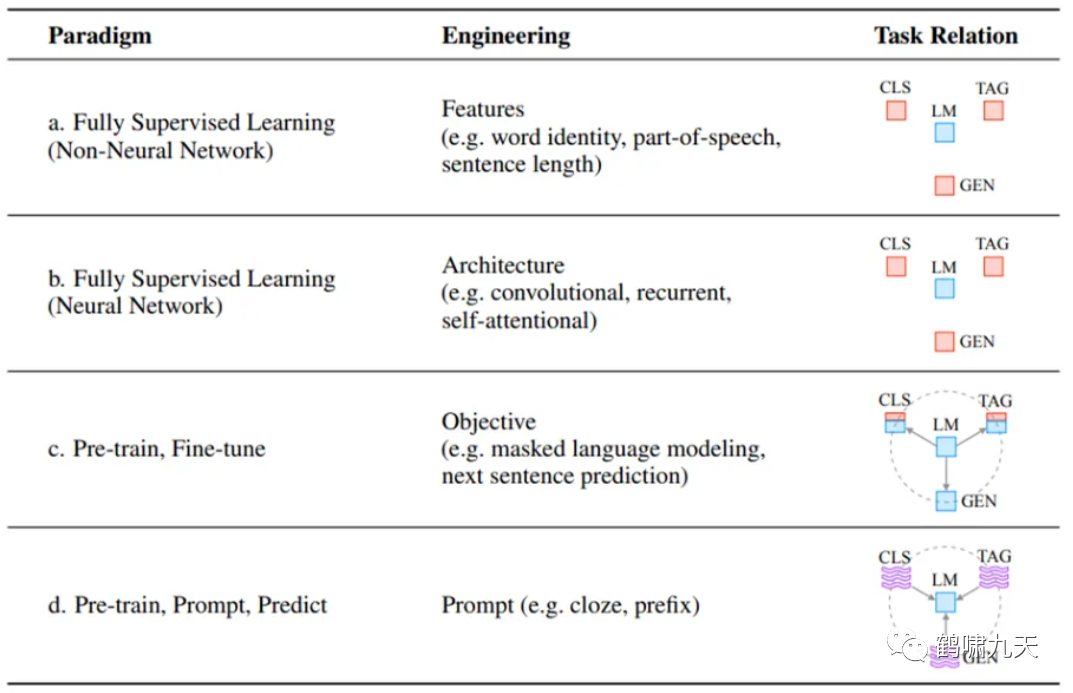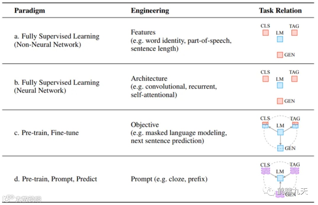 | ④pre-train、prompt与predict | 提示 | 完形填空、前缀 | 语言模型为中心,含文本提示 |