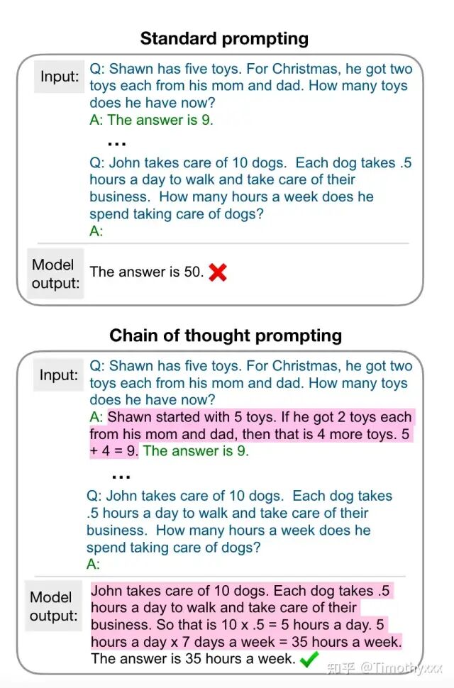 论文里的示例:不再是死板的提供问题和答案样例,而是给出中间推理环节,让模型学习到中间过程里的推理逻辑和思考方式。