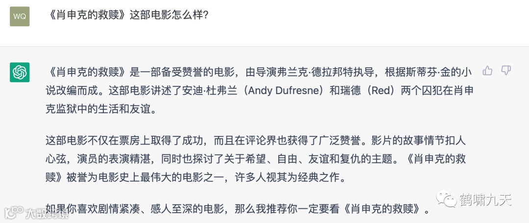 输入:“《肖申克的救赎》这部电影怎么样?”
