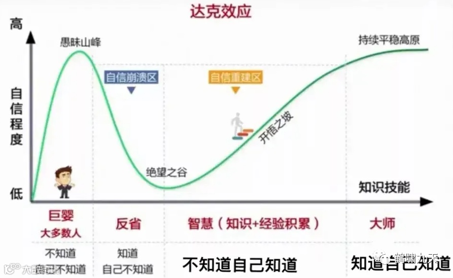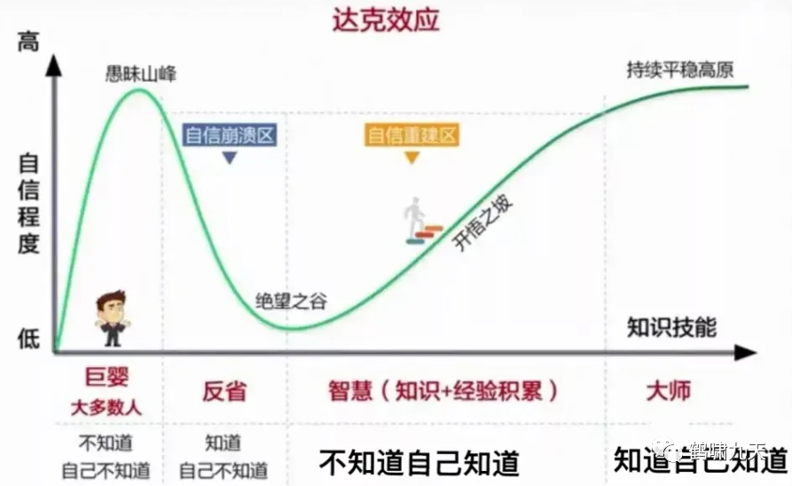 单从认知过程来看,达克效应提醒我们,人对陌生事物的认知存在一定规律:愚昧山峰→绝望之谷→开悟之坡→平稳高原