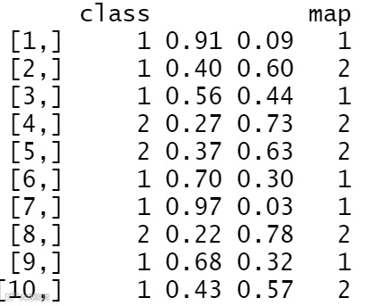 # two-class caseclass <- factor(c(1,1,1,2,2,1,1,2,1,1), levels = 1:2)probs <- matrix(c(0.91, 0.4, 0.56, 0.27, 0.37, 0.7, 0.97, 0.22, 0.68, 0.43, 0.09, 0.6, 0.44, 0.73, 0.63, 0.3, 0.03, 0.78, 0.32, 0.57), nrow = 10, ncol = 2)cbind(class, probs, map = map(probs))