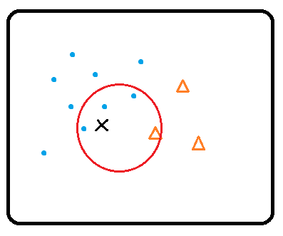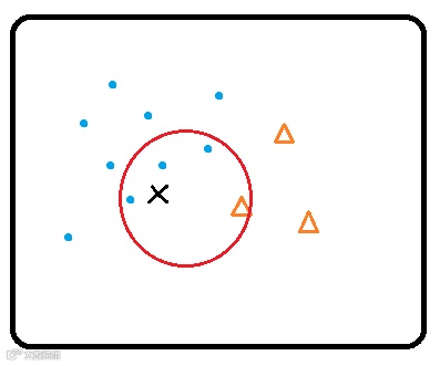 我们要想预测X的类别,就选择X最近的几个样本,红色圆圈里有4个样本,其中3个为蓝色的圆点,只有一个是橙色三角形。那么X类别大概率为蓝色圆点。