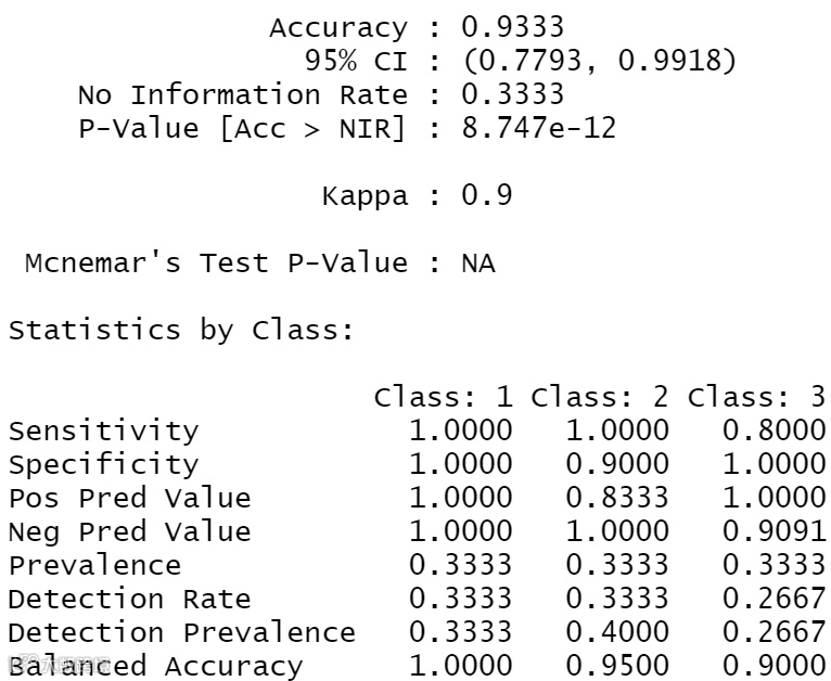 #3.confusion matrixknn_cf <- caret::confusionMatrix(as.factor(knn_test), as.factor(as.numeric(testset$Species)))print(knn_cf)