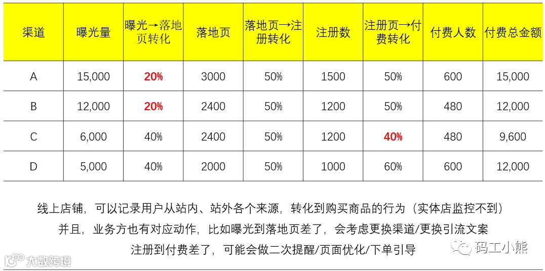 漏斗分析法,一般用于线上销售,比如将店铺业绩拆分为:UV*转化率*客单价,之后可以进一步看到:店铺流量少了,还是转化率跌了(如下图)。