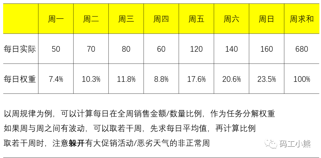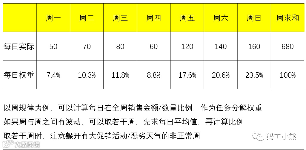 这些也被称作:自然周期。做销售分析,找到业务的自然周期很重要,具体找法,参照周期性分析法。在分解销售目标的时候,一般会把年度目标,按照自然周期做拆分,落实到每一季度/每一月/每一周/每一天(如下图)。