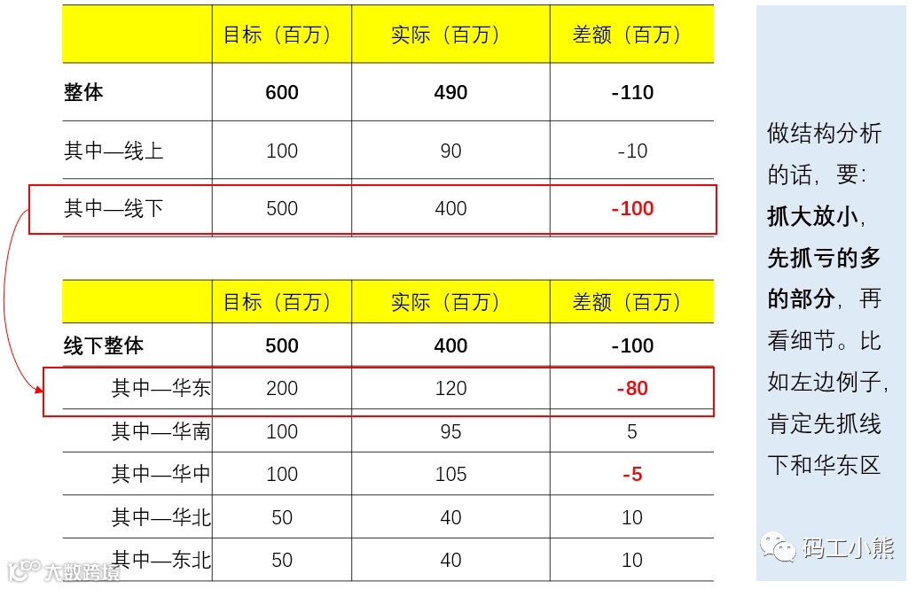 举个简单例子,一个公司有线上/线下两大销售渠道,整体销售业绩如下图所示。在业绩不达标的时候,应该先看:线上/线下,哪个是不达标主要原因。如果发现线下是主要原因,就再看线下的结构,线下一共有5大大区,进一步看(如下图)。
