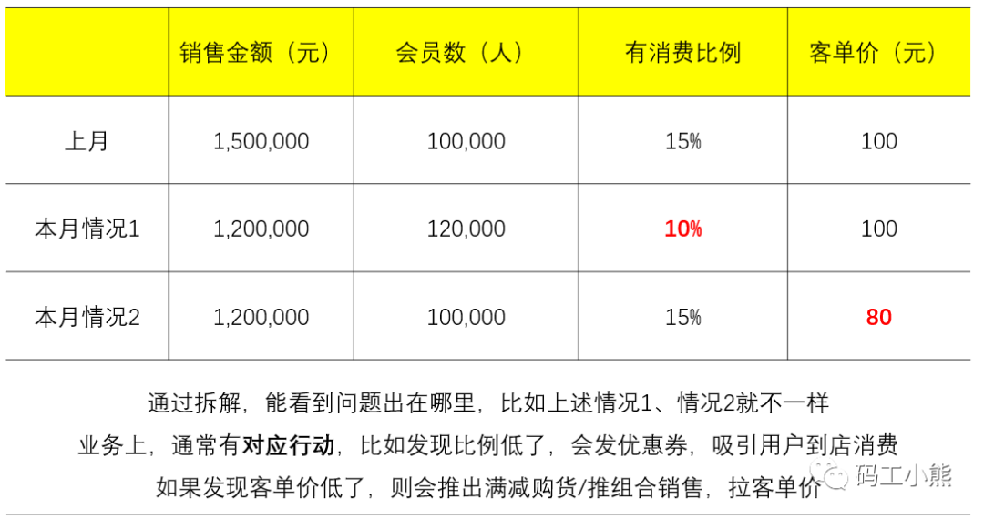 指标拆解法,一般用于线下销售。比如将门店业绩拆分为:客户数*消费率*客单价,之后可以看到:到底是因为来消费的客人少了,还是客户消费力下降了(如下图)。