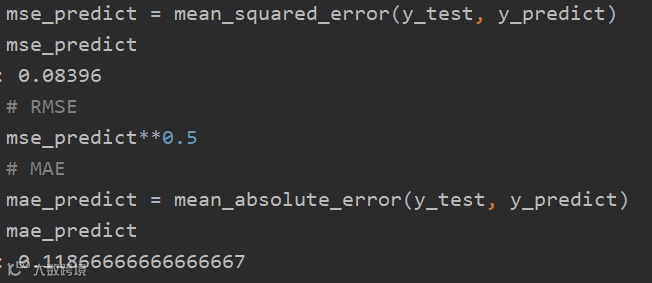 #MSEmse_predict = mean_squared_error(y_test, y_predict)mse_predict#RMSEmse_predict**0.5#MAEmae_predict = mean_absolute_error(y_test, y_predict)mae_predict