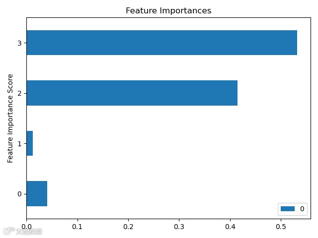 feat_imp = pd.DataFrame(reg.feature_importances_)feat_imp.plot(kind='barh', title='Feature Importances')plt.ylabel('Feature Importance Score')plt.show()