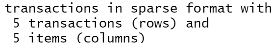 # Use the constructor to create transactionstrans1 <- transactions(a_list)trans1