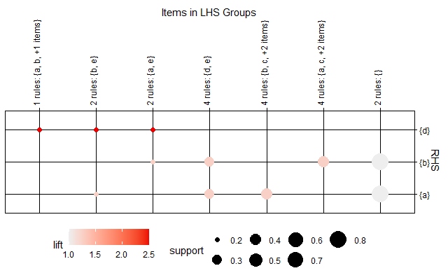 所有规则是按支持度support从大到小的顺序排列。根据业务需求,也可以按置信度confidence排列。可以看到,除了单独出现的a、b, 第三个支持度较高的规则是d与b同时出现,支持度为0.4。