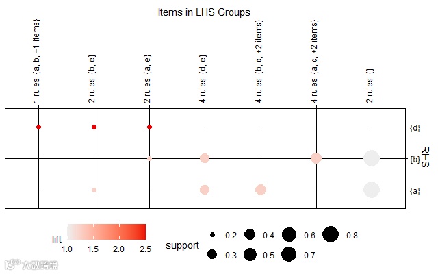 到这一步,关联规则的分析已经可以报告结果了。但以上规则可能不够直观,那么,我们来进行可视化展示吧!