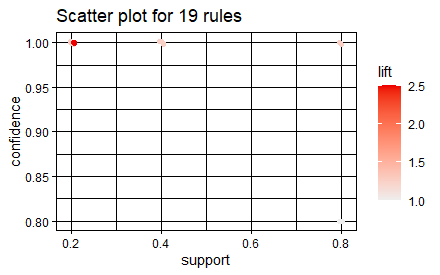 以上采用的是默认参数,筛选出所有规则,一共有19个规则。但有一些规则可能支持度、置信度较低,其实不是我们想要筛选的对象,这时我们可以通过supp与conf两个参数,来设定最小支持度、最小置信区间。