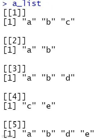 a_list <- list(c("a","b","c"),c("a","b"),c("a","b","d"),c("c","e"),c("a","b","d","e"))