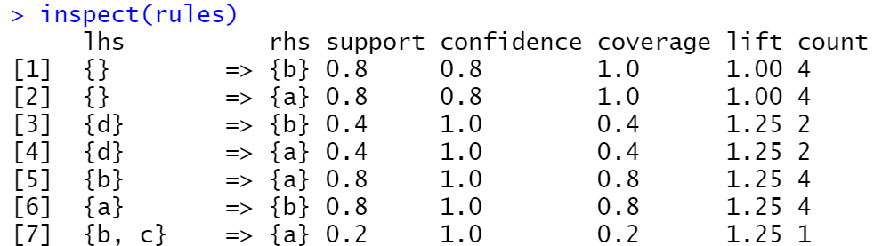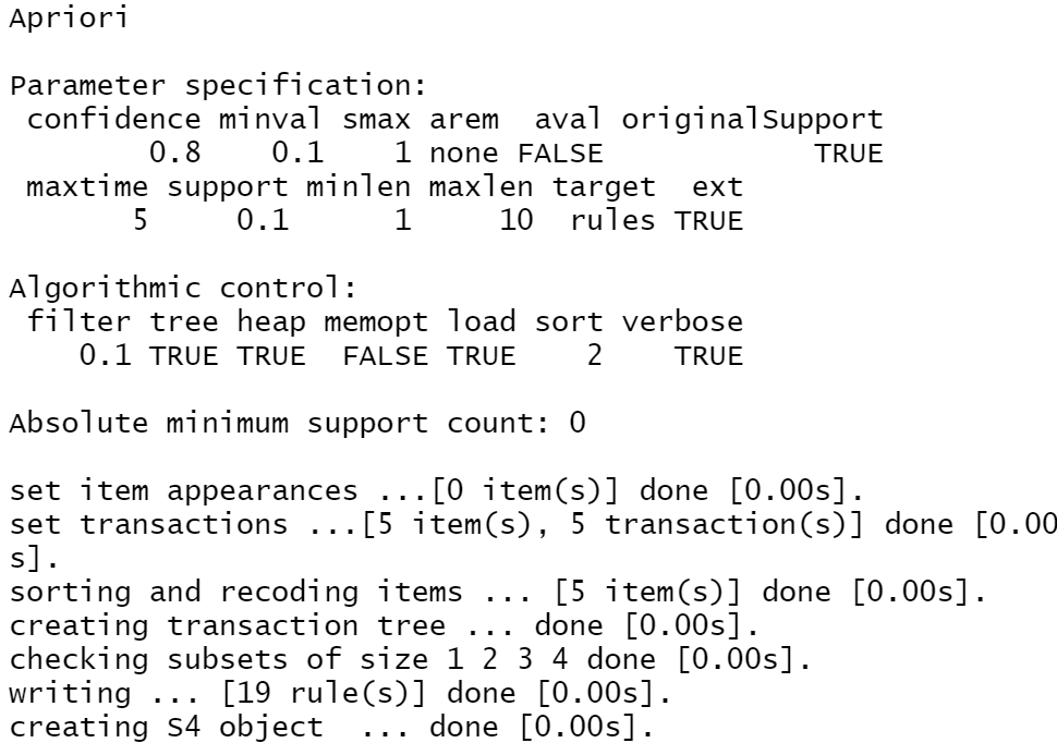 rules <- apriori(a_list,parameter = list(supp = 0.5, conf = 0.9, target = "rules"))summary(rules)