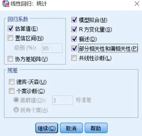 在“统计”中,勾选上“R方变化量”。方便我们后续查看中介变量对模型的影响。