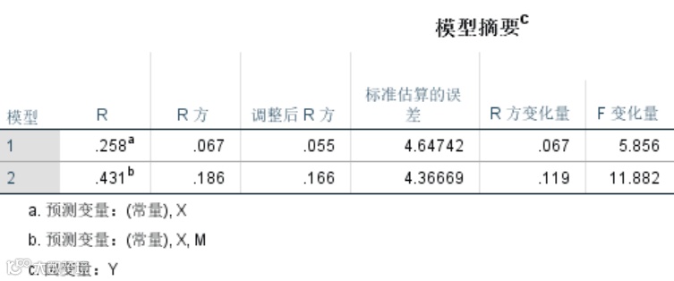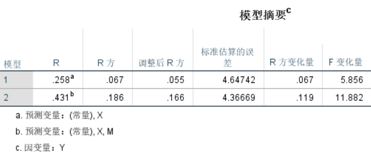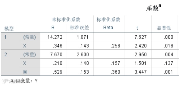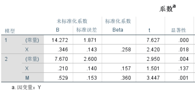 再看看最后一列的显著性,模型1自变量X的显著性为0.018,小于0.05,说明自变量X对因变量Y是有显著影响的。模型2中,自变量X的显著性为0.137,大于0.05,自变量X对于因变量Y的影响变得不显著了。中介变量M对因变量的影响是显著的。