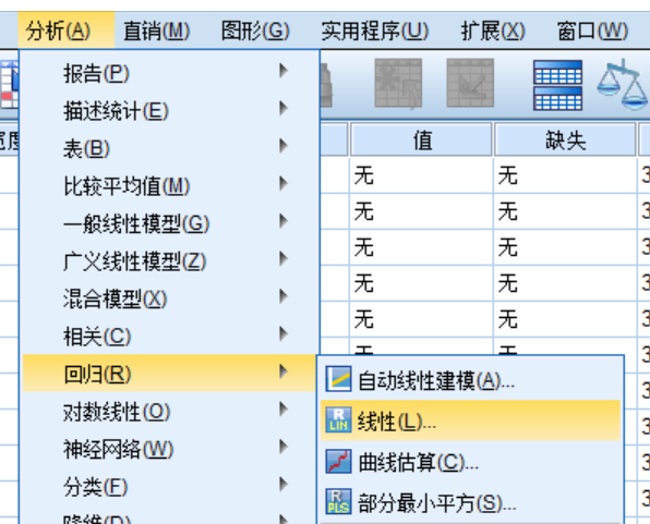在SPSS里,中介效应的操作过程是建立线性回归模型。点击“分析”——“回归”——“线性”,打开线性回归的界面。