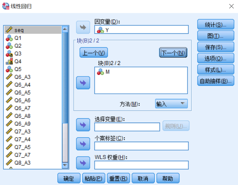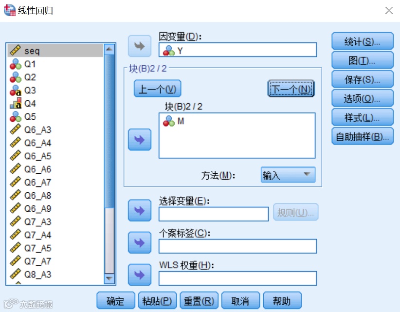 把自变量X放到第一个Block(块),点击“下一个”,中介变量M放到第二个Block(块)。