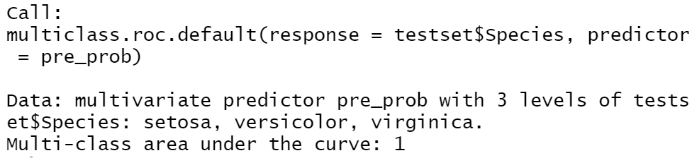 #多类别计算AUC,multiclass.roclibrary(pROC)pre_prob <- data.frame(pre$prob)names(pre_prob) <- levels(testset$Species)roc_ada <- multiclass.roc(testset$Species,pre_prob)