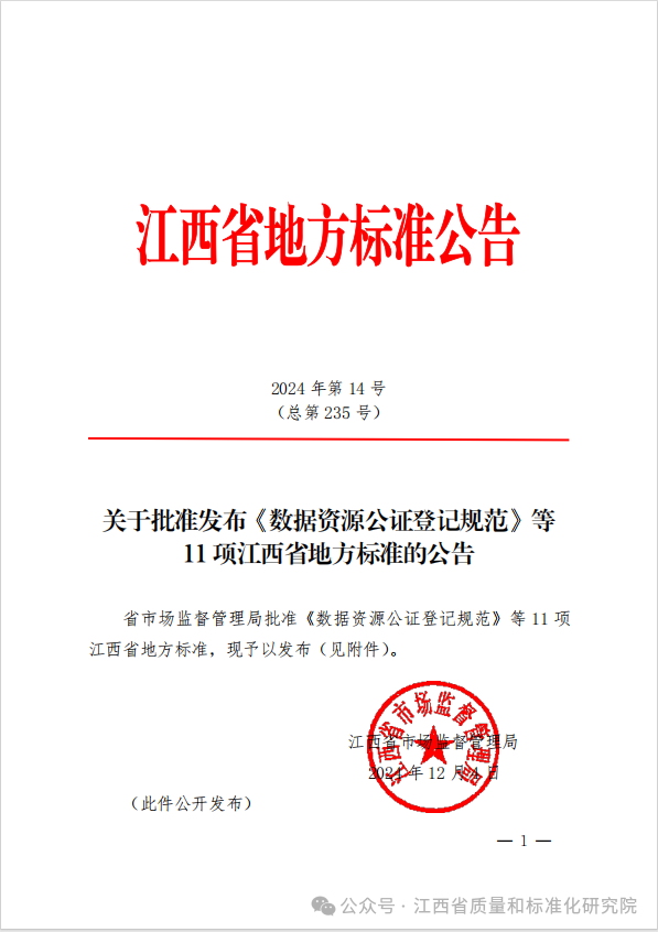 近日,江西省市场监督管理局批准发布了《数据资源公证登记规范》等11项地方标准,涉及生态文明、社会管理和公共服务、空间规划以及农业等多个领域,且将于2025年6月1日施行。