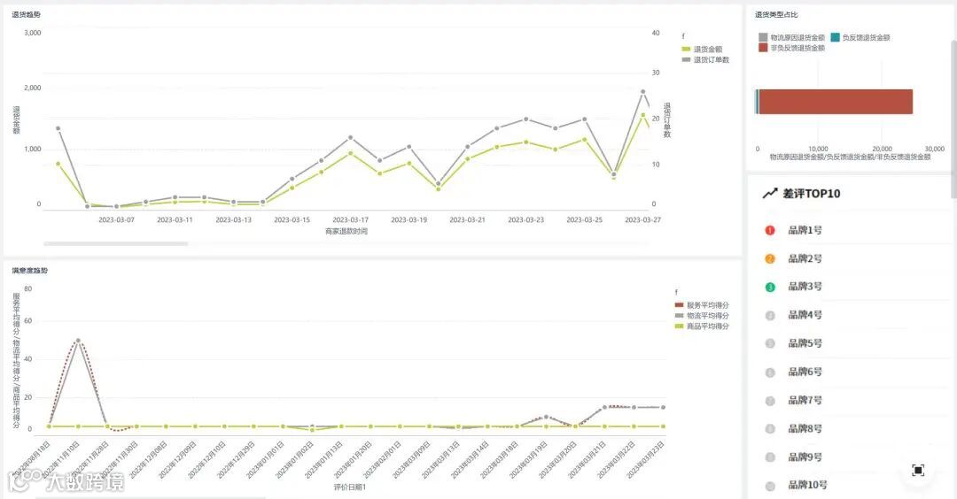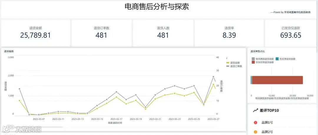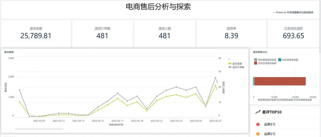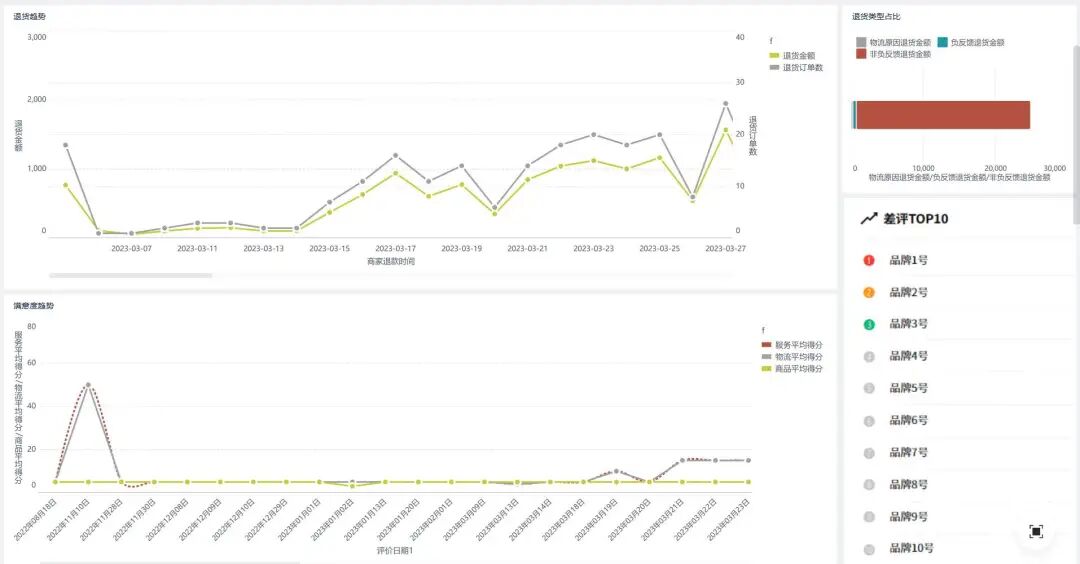 (2)关联差评:结合差评TOP10,分析退货是否因商品差评集中爆发,找出差评率高的品牌、商品,追溯源头 。