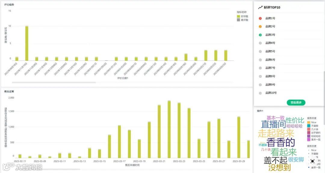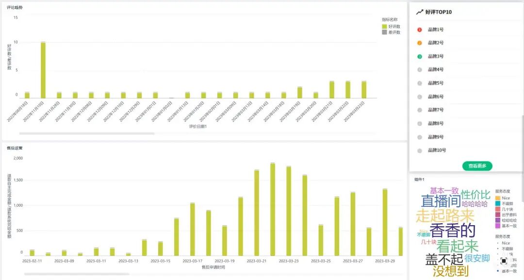 售后运营退款数据显示,3月下旬退款金额高,可能对应前期订单的售后集中处理;评论趋势中,部分日期好评、差评数波动,反映促销带来评价量变化,且好评TOP10品牌可挖掘优势经验 。