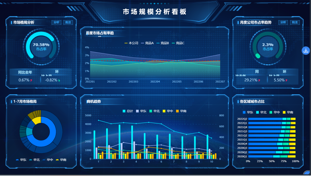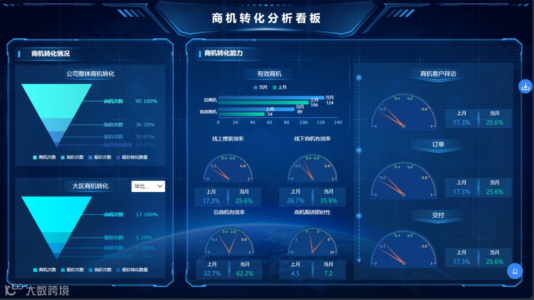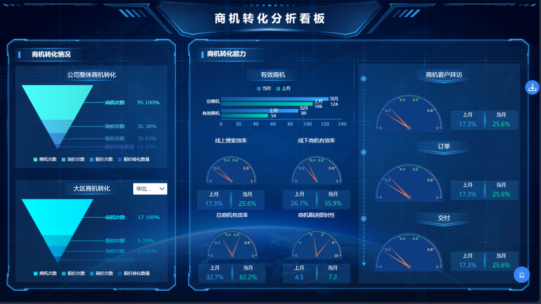 商机趋势:柱状图和折线图展示了不同区域的商机数量和趋势。这有助于预算分析中识别潜在的市场机会和需求,为销售和产品开发提供指导。