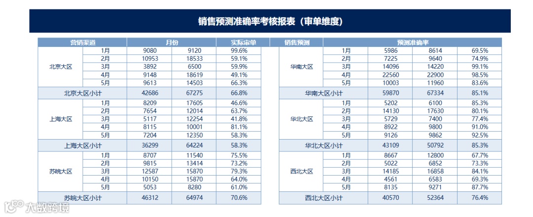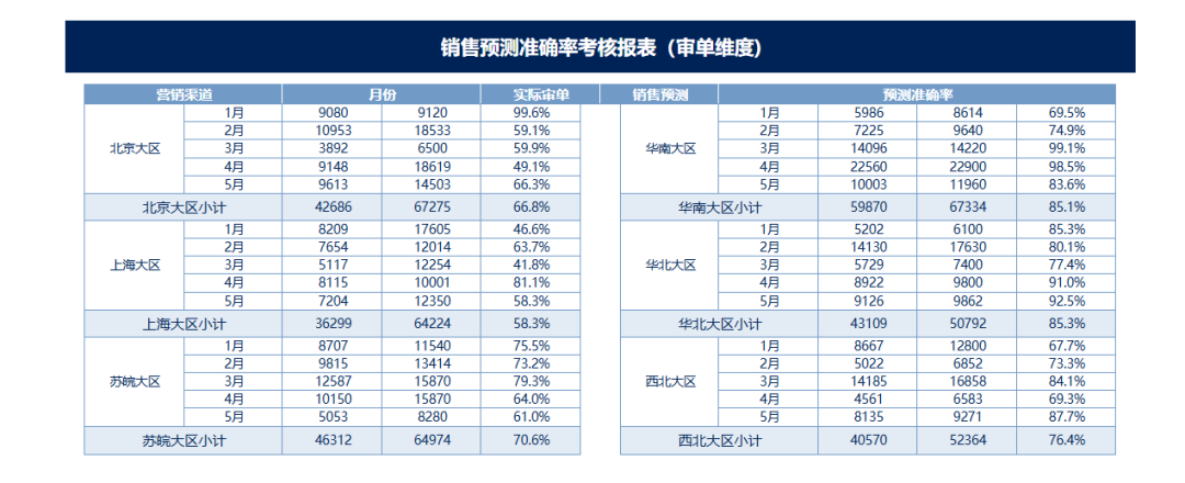 这张销售预测准确率考核报表,则详细列出了不同大区在不同月份的销售预测与实际订单的对比数据。我们下面来针对报表内容讲一下这里面包含了哪些目标设定的小技巧。