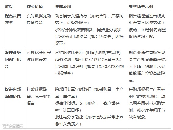 BI 看板对于企业来说具有很多重要的价值,具体而言,包括以下几个方面: