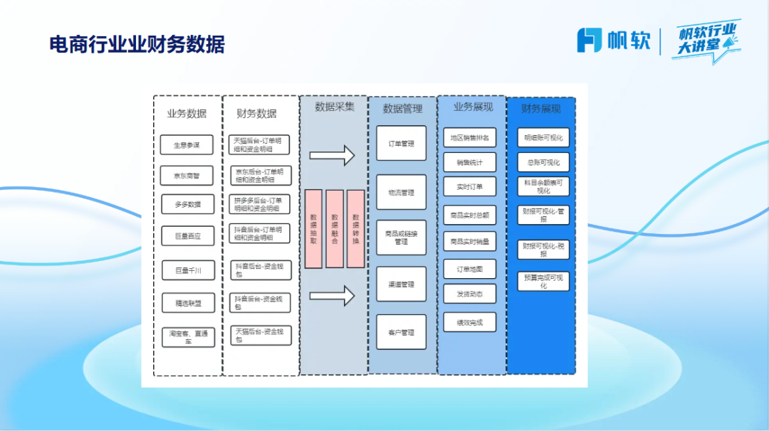 业财一体化是指将业务流程中的数据与财务管理相结合,形成一种新的协同工作模式。在电商领域,这意味着通过数据的整合和分析,构建一个新的协同工作模式,使得业务和财务不再是孤立的两个部分,而是紧密结合、相互支持的一体。这种模式可以帮助企业从海量数据中获取真正的价值,及时洞察和决策新的机会与风险。