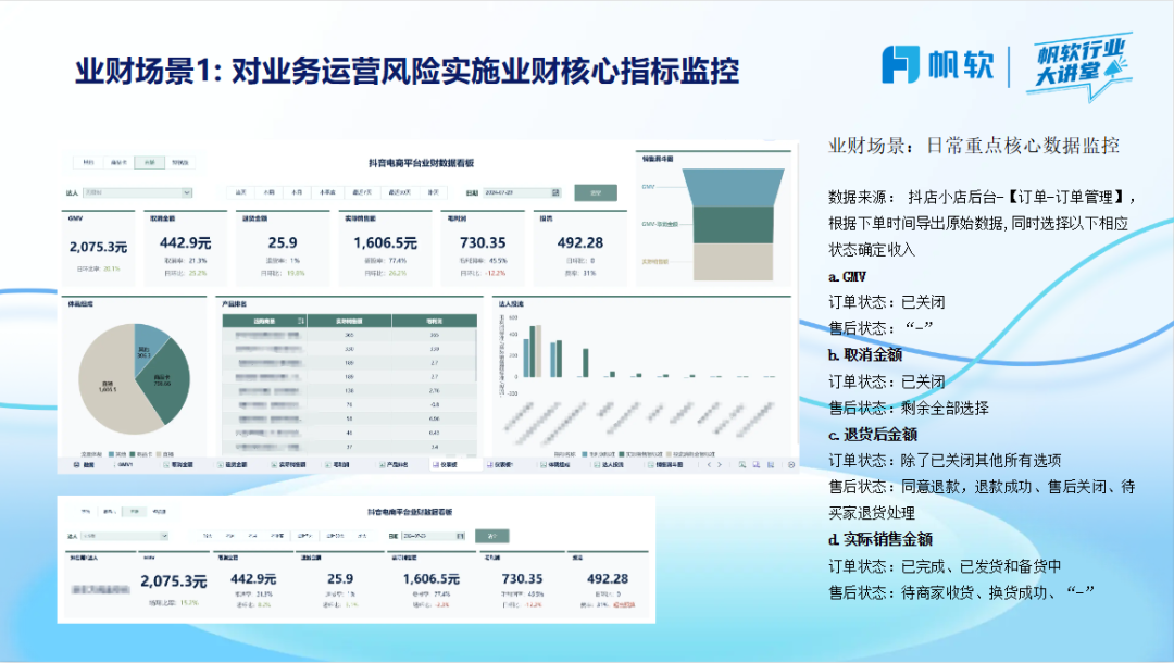 该模型是业财一体化中的关键工具,用于实时监控业务和财务的核心指标,如总成交额(GMV)、取消订单金额、退货金额等。这些指标能够直观反映业务运营的健康状况和潜在风险。通过对这些关键数据的持续跟踪和分析,管理层可以迅速识别问题,及时调整策略,以降低风险和优化业务流程。例如,如果退货金额突增,可能表明产品质量或客户服务存在问题,需要立即关注和解决。