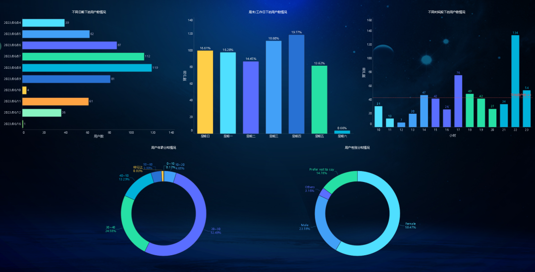 不同日期下,2023年6月4 - 16日期间,每日用户数有波动,如6月8日用户数为119,6月12日为36。周末/工作日维度,周六用户数占比最低为0.66%,周四最高为19.77%。不同时间段里,22 - 23时用户数达134,为一天中活跃高峰,11时仅7人,活跃度低。