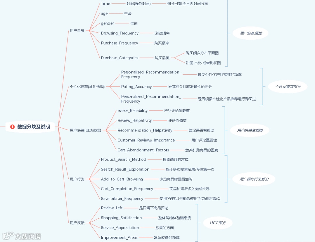 以下是根据上述分析思路而进行的实际操作,按照用户自身属性、个性化推荐、用户决策、用户行为、用户反馈五个模块展开对用户行为和用户标签的探索和分析,最后得出用户画像: