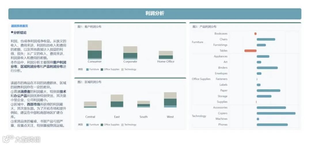 该超市的商品在不同的消费群体、区域的销售利润存在一定的差异。消费群体中,普通消费者的利润最大,特别是技术和办公产品利润优势特别突出;区域中,西部市场所获得的利润最大,为了开拓市场和提升例如,建议在中部和南部地区扩建仓库;需要注意,家具品类的餐桌、书架产品亏损严重,应重点关注,特别重视物流运输、市场费用和其他成本费用。